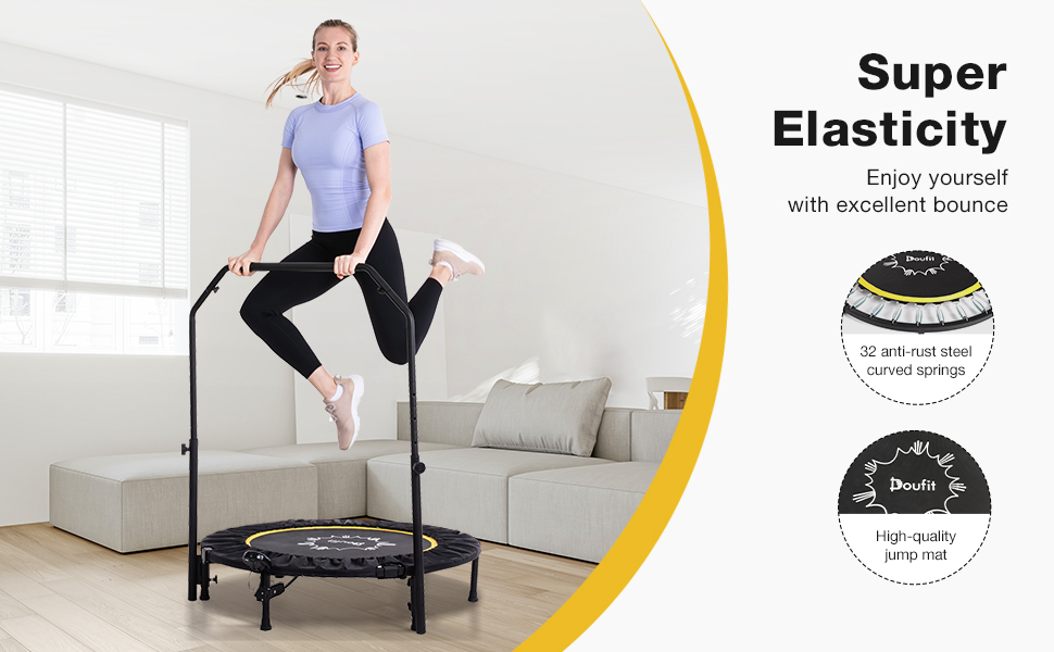 In total 4 different levels of handle height, range from 15.86'' to 19.21", can be adjusted to fit adults and kids. Doufit Mini fitness trampoline can be used indoor or outdoor for a supercharged workout that enhances fitness results, stimulates your metabolism, and helps you build muscle and lose weight while having fun.